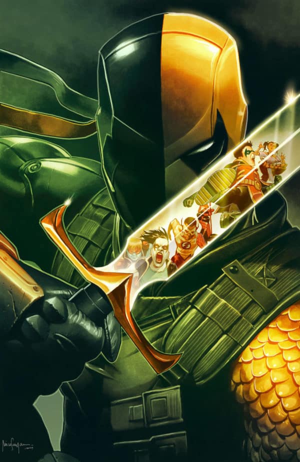 "The Terminus Agenda" part one! The hunter becomes the hunted as Robin and the Teen Titans set out to end Deathstroke once and for all! But no man has ever gone toe-to-toe with the World's Deadliest Assassin and walked away unscathed! Lines will be crossed, secrets will be revealed and blood will be shed! Don't miss the crossover event of the spring, which kicks off a bold new era for Teen Titans and Deathstroke!