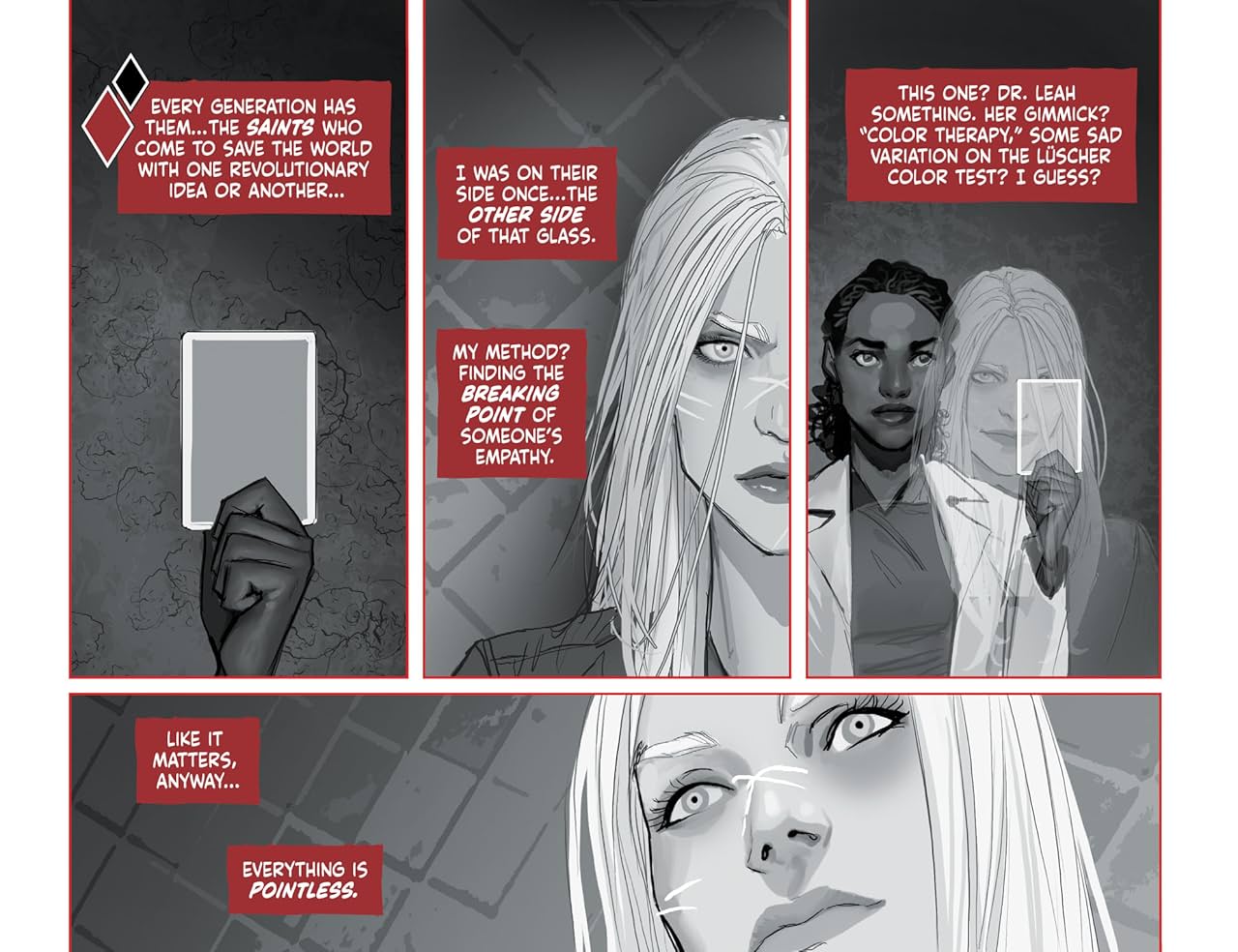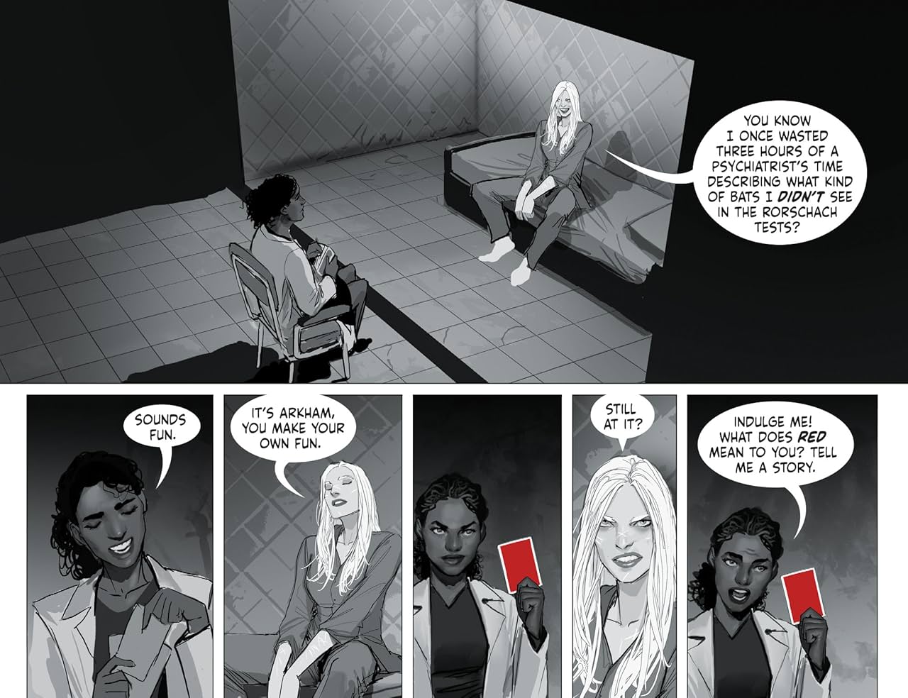 Resolutely defiant in the face of all of Arkham’s attempts to psychoanalyze her, Harley Quinn is suddenly compelled to reveal some of her most vulnerable thoughts - and hints of her future -- when confronted with the simplest of prompts: “What does the color red mean to you?” Another stunningly beautiful story from the world of Stjepan Šejić’s bestselling HARLEEN!