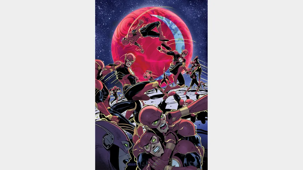 On one side: Wally West. And Wally West. And Wally West. Using his newfound powerset gained after the Justice League’s battle with Darkseid, he’s split himself hundreds of times, into an army of TEMPS, as Wally keeps going while spreading himself thinner and thinner.