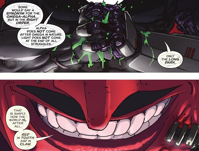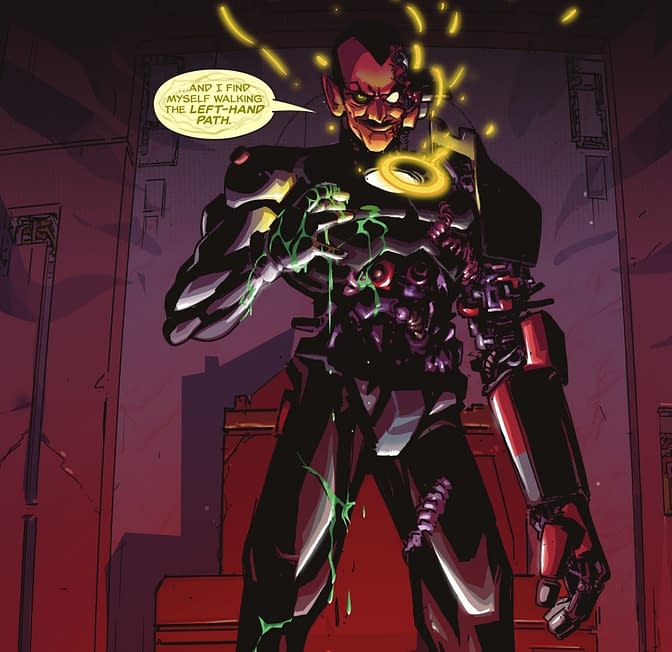 Na edição, o Sinestro aparece como um ciborgue bizarro que aparenta ter os poderes do anel, mesmo não o usando. Veja: